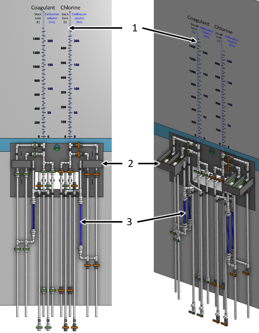 The constant level tank system provides convenient central controls for selection of stock tank, flow calibration, purging sediment, and selection of which of the duplicate chemical feed systems to use. The system has built in redundancy with duplicate systems for dosing each chemical to facilitate routine cleaning and maintenance.